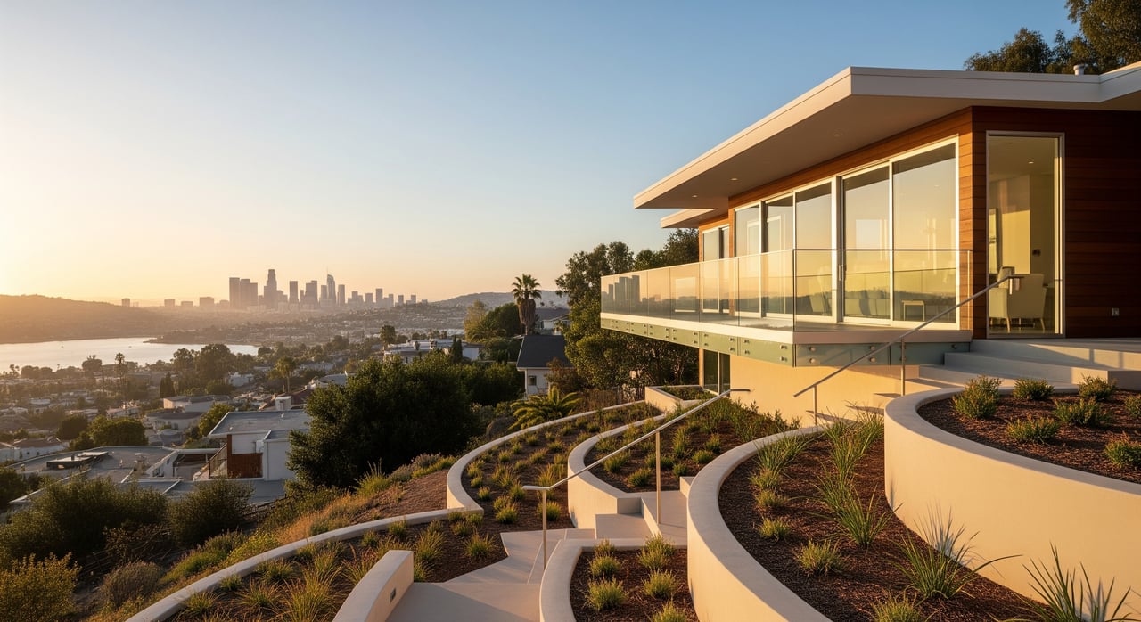 Built in the ’50s but updated since, the two-story home enjoys city and canyon views from its hillside perch. Wood accents pop up across the open floor plan, lining the floors, doors and windows.